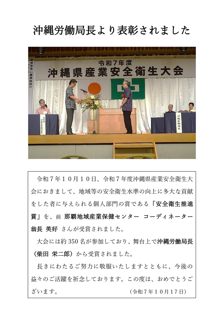前那覇地域産業保健センターコーディネーター・翁長英好さん沖縄労働局長より表彰されました!